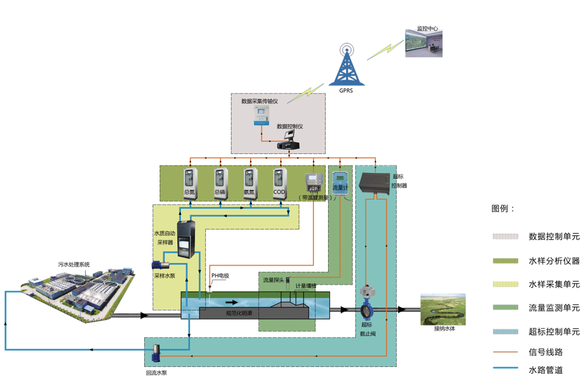 污染源水質(zhì)在線監(jiān)測系統(tǒng)適用于各排污企業(yè)對污染源水質(zhì)排污監(jiān)控及控制的需求。該系統(tǒng)根據(jù)2020年國家技術(shù)規(guī)范(HJ353-2019)和其他標(biāo)準進行設(shè)計,由實現(xiàn)水污染源流量監(jiān)測、水污染源水樣采集、分析及分析數(shù)據(jù)統(tǒng)計與上傳等功能的軟硬件設(shè)施組成的系統(tǒng)。該系統(tǒng)具有監(jiān)測數(shù)據(jù)實時采集、傳輸、管理、質(zhì)控、反控等功能,還具有水質(zhì)治理設(shè)施運行情況分析功能和排污總量控制功能。